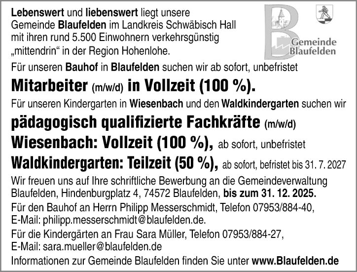 Für den Bauhof an Herrn Philipp Messerschmidt, Telefon 07953/884-40, E-Mail: philipp.messerschmidt@blaufelden.de.