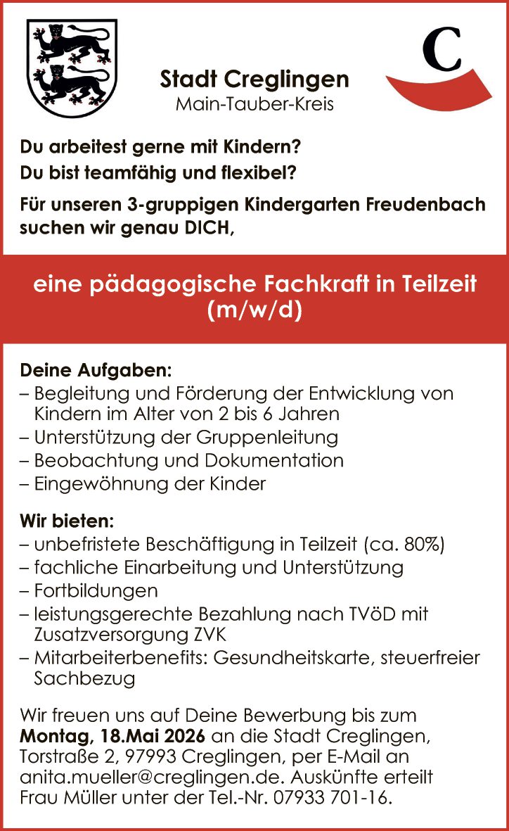 Du arbeitest gerne mit Kindern? Du bist teamfähig und flexibel? Für unseren 3-gruppigen Kindergarten Freudenbach suchen wir genau DICH, eine pädagogische Fachkraft in Teilzeit (m/w/d).