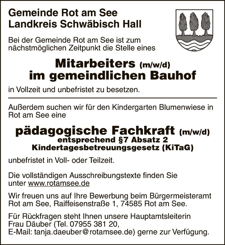 Für Rückfragen steht Ihnen unsere Hauptamtsleiterin Frau Däuber (Tel. 07955 381 20, E-Mail: tanja.daeuber@rotamsee.de) gerne zur Verfügung.