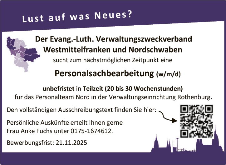 Der Evang.-Luth. Verwaltungszweckverband Westmittelfranken und Nordschwaben sucht zum nĂ€chstmöglichen Zeitpunkt eine Personalsachbearbeitung (w/m/d) unbefristet in Teilzeit (20 bis 30 Wochenstunden) fĂŒr das Personalteam Nord in der Verwaltungseinrichtung Rothenburg.