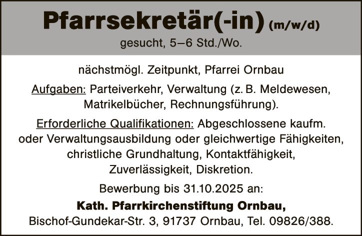 Pfarrsekretär(-in) (m/w/d) gesucht, 5–6 Std./Wo. nächstmögl. Zeitpunkt, Pfarrei Ornbau.