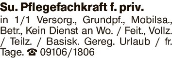 Su. Pflegefachkraft f. priv. in 1/1 Versorg., Grundpf., Mobilsa., Betr., Kein Dienst an Wo. / Feit., Vollz./ Teilz. / Basisk. Gereg. Urlaub / fr. Tage.