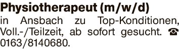 Physiotherapeut (m/w/d) in Ansbach zu Top-Konditionen, Voll.-/Teilzeit, ab sofort gesucht.