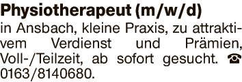 Physiotherapeut (m/w/d) in Ansbach, kleine Praxis, zu attraktivem Verdienst und Prämien, Voll-/Teilzeit, ab sofort gesucht.