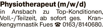 Physiotherapeut (m/w/d) in Ansbach zu Top-Konditionen, Voll.-/Teilzeit, ab sofort ges.