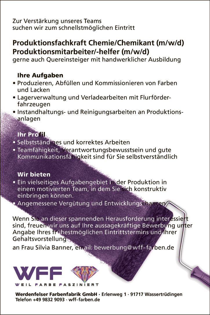 Wenn Sie an dieser spannenden Herausforderung interessiert sind, freuen wir uns auf Ihre aussagekräftige Bewerbung unter Angabe Ihres frühestmöglichen Eintrittstermins und Ihrer Gehaltsvorstellung an Frau Silvia Banner, email: bewerbung@wff-farben.de