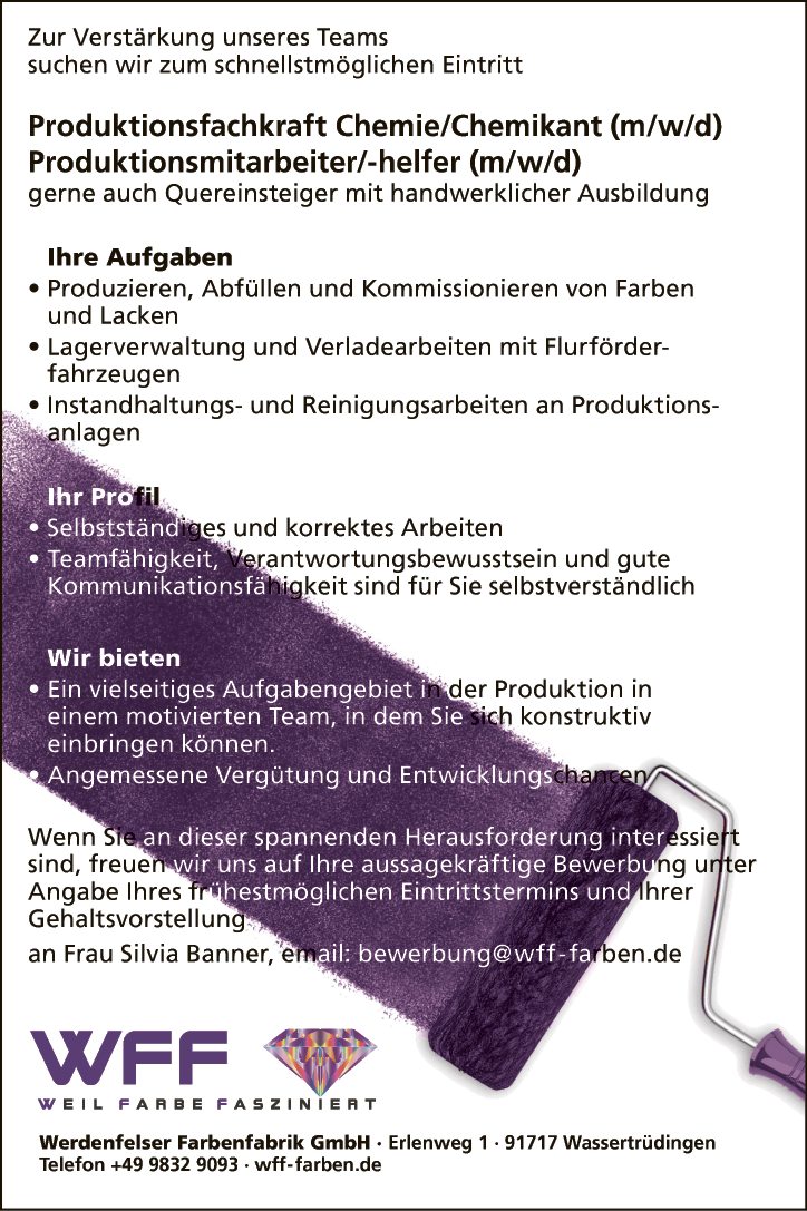 Wenn Sie an dieser spannenden Herausforderung interessiert sind, freuen wir uns auf Ihre aussagekräftige Bewerbung unter Angabe Ihres frühestmöglichen Eintrittstermins und Ihrer Gehaltsvorstellung an Frau Silvia Banner, email: bewerbung@wff- farben.de