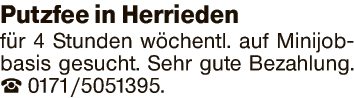 Putzfee in Herrieden fĂŒr 4 Stunden wöchentl. auf Minijobbasis gesucht.