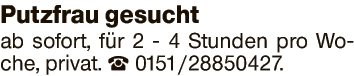 Putzfrau gesucht ab sofort, fĂźr 2 - 4 Stunden pro Woche, privat.