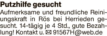 Putzhilfe gesucht Aufmerksame und freundliche Reinigungskraft in Rös bei Herrieden gesucht. 14-tägig je 4 Std., gute Bezahlung!