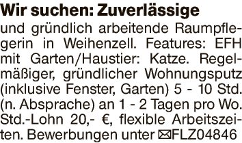 in Weihenzell. Features: EFH mit Garten/Haustier: Katze. Regelmäßiger, gründlicher Wohnungsputz (inklusive Fenster, Garten) 5 - 10 Std. (n. Absprache) an 1 - 2 Tagen pro Wo. Std.-Lohn 20,- €, flexible Arbeitszeiten.