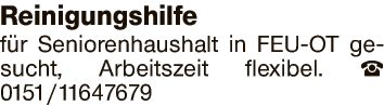 Reinigungshilfe fĂźr Seniorenhaushalt in FEU-OT gesucht, Arbeitszeit flexibel.