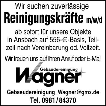 Wir suchen zuverlässige Reinigungskräfte m/w/d ab sofort für unsere Objekte in Ansbach auf 556-€-Basis, Teilzeit nach Vereinbarung od. Vollzeit.