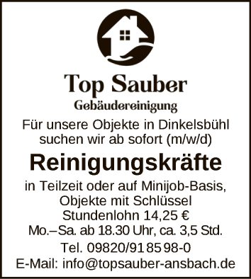 Für unsere Objekte in Dinkelsbühl suchen wir ab sofort (m/w/d) Reinigungskräfte in Teilzeit oder auf Minijob-Basis, Objekte mit Schlüssel.