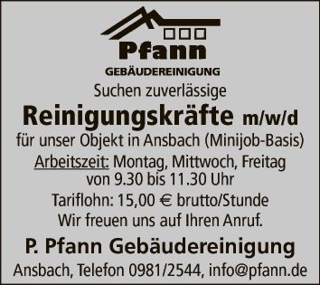 Suchen zuverlässige Reinigungskräfte m/w/d für unser Objekt in Ansbach (Minijob-Basis).