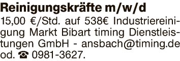 Reinigungskräfte m/w/d 15,00 €/Std. auf 538€ Industriereinigung Markt Bibart.