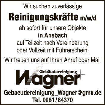 Wir suchen zuverlässige Reinigungskräfte m/w/d ab sofort für unsere Objekte in Ansbach auf Teilzeit nach Vereinbarung oder Vollzeit mit Führerschein.
