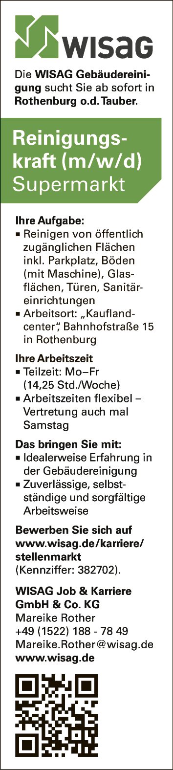Jetzt Printanzeige ansehenDie WISAG Gebäudereinigung sucht Sie ab sofort in Rothenburg o.d. Tauber.