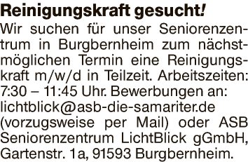 Jetzt Printanzeige ansehenFür unser Seniorenzentrum in Burgbernheim suchen wir zum nächstmöglichen Termin eine Reinigungskraft m/w/d in Teilzeit.