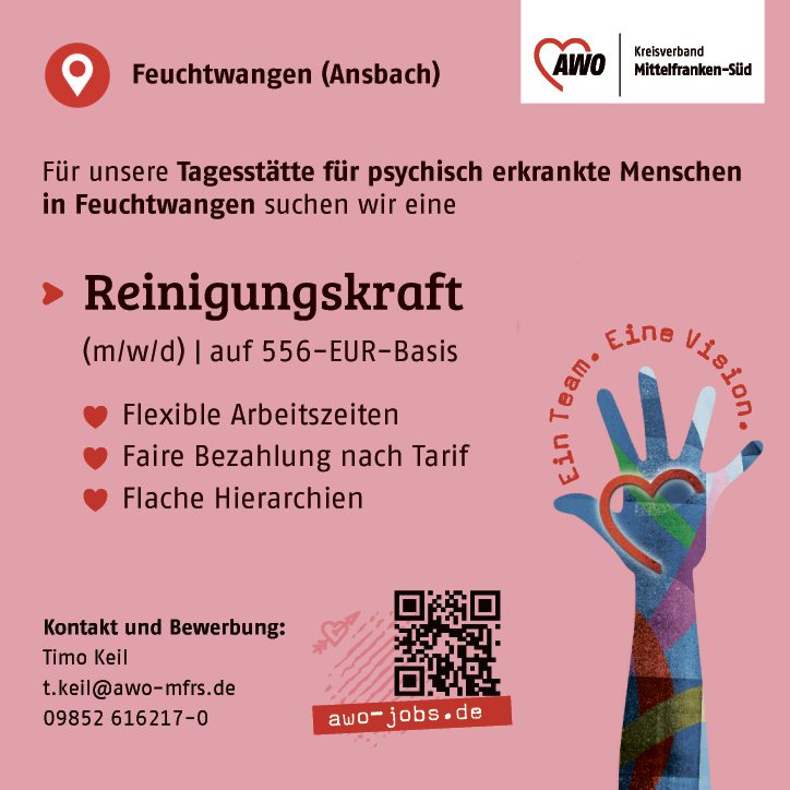 Für unsere Tagesstätte für psychisch erkrankte Menschen in Feuchtwangen suchen wir eine Reinigungskraft (m/w/d) auf 556-EUR-Basis.