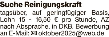Suche Reinigungskraft tagsüber, auf geringfügiger Basis, Lohn 15 - 16,50 € pro Stunde, AZ nach Absprache, in DKB.