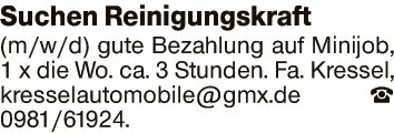 Suchen Reinigungskraft (m/w/d) gute Bezahlung auf Minijob, 1 x die Wo. ca. 3 Stunden.