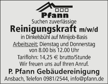 Suchen zuverlässige Reinigungskraft m/w/d in Dinkelsbühl auf Minijob-Basis.