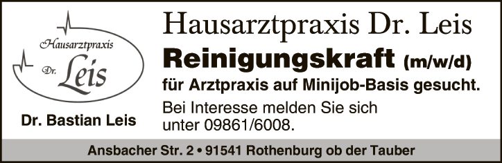Reinigungskraft (m/w/d) fĂźr Arztpraxis auf Minijob-Basis gesucht.