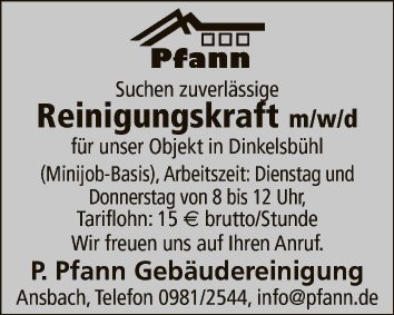 für unser Objekt in Dinkelsbühl (Minijob-Basis), Arbeitszeit: Dienstag und Donnerstag von 8 bis 12 Uhr, Tariflohn: 15 € brutto/Stunde
