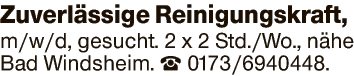 Zuverlässige Reinigungskraft m/w/d, gesucht. 2 x 2 Std./Wo., nähe Bad Windsheim.