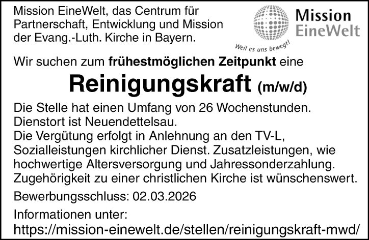 Informationen unter: https://mission-einewelt.de/stellen/reinigungskraft-mwd/