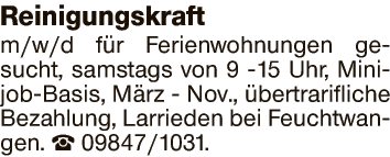 Reinigungskraft m/w/d fßr Ferienwohnungen gesucht, samstags von 9 -15 Uhr, Minijob-Basis, März - Nov., ßbertrarifliche Bezahlung, Larrieden bei Feuchtwangen.