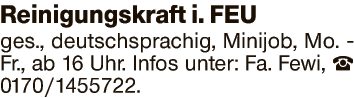 Reinigungskraft i. FEU ges., deutschsprachig, Minijob, Mo. Fr., ab 16 Uhr.