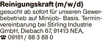 Reinigungskraft (m/w/d) gesucht ab sofort fĂźr unseren Gewerbebetrieb auf Minijob- Basis.