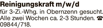 Reinigungskraft m/w/d fĂźr 3-Zi.-Whg. in Obernzenn gesucht.