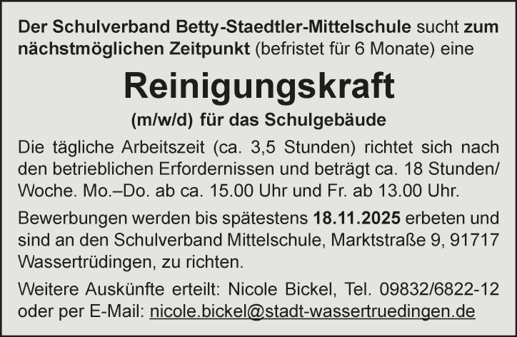 Der Schulverband Betty-Staedtler Mittelschule sucht zum nächstmöglichen Zeitpunkt (befristet für 6 Monate) eine Reinigungskraft (m/w/d) für das Schulgebäude.