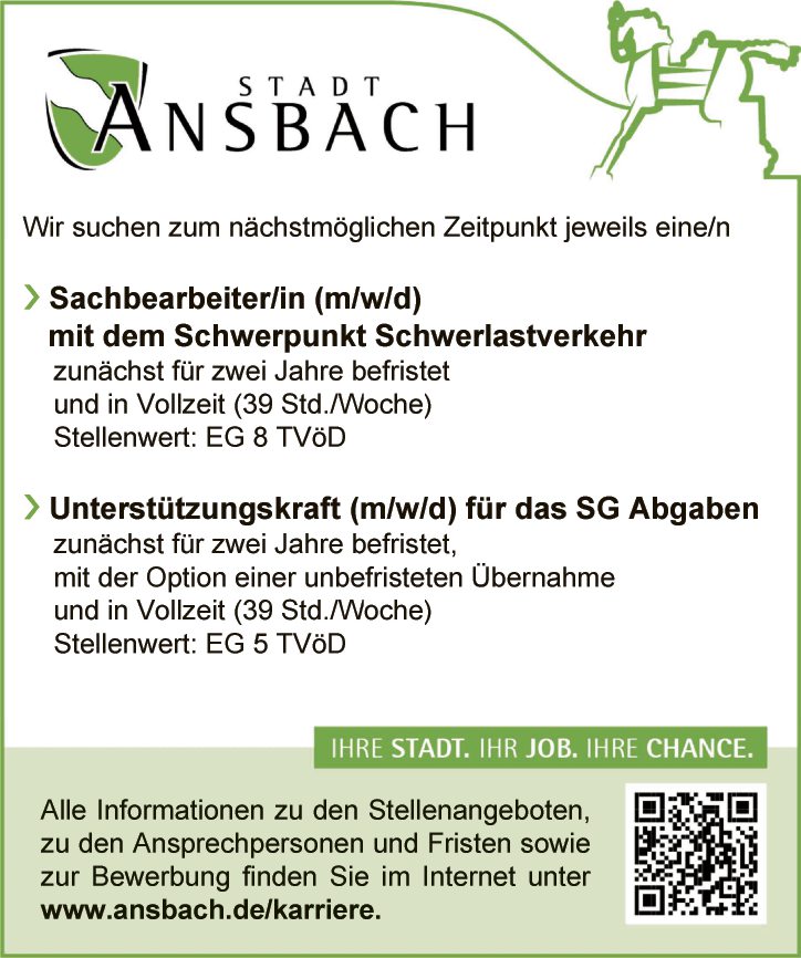 Alle Informationen zu den Stellenangeboten, zu den Ansprechpersonen und Fristen sowie zur Bewerbung finden Sie im Internet unter www.ansbach.de/karriere.