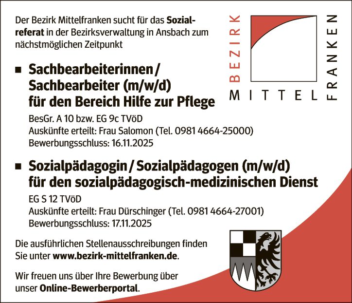 Die ausführlichen Stellenausschreibungen finden Sie unter www.bezirk-mittelfranken.de.