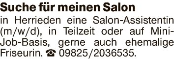 Suche fĂźr meinen Salon in Herrieden eine Salon-Assistentin (m/w/d), in Teilzeit oder auf MiniJob-Basis, gerne auch ehemalige Friseurin.