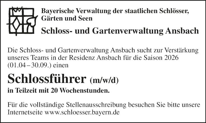 Die Schloss- und Gartenverwaltung Ansbach sucht zur Verstärkung unseres Teams in der Residenz Ansbach für die Saison 2026 (01.04 – 30.09.) einen Schlossführer (m/w/d) in Teilzeit mit 25 Wochenstunden.