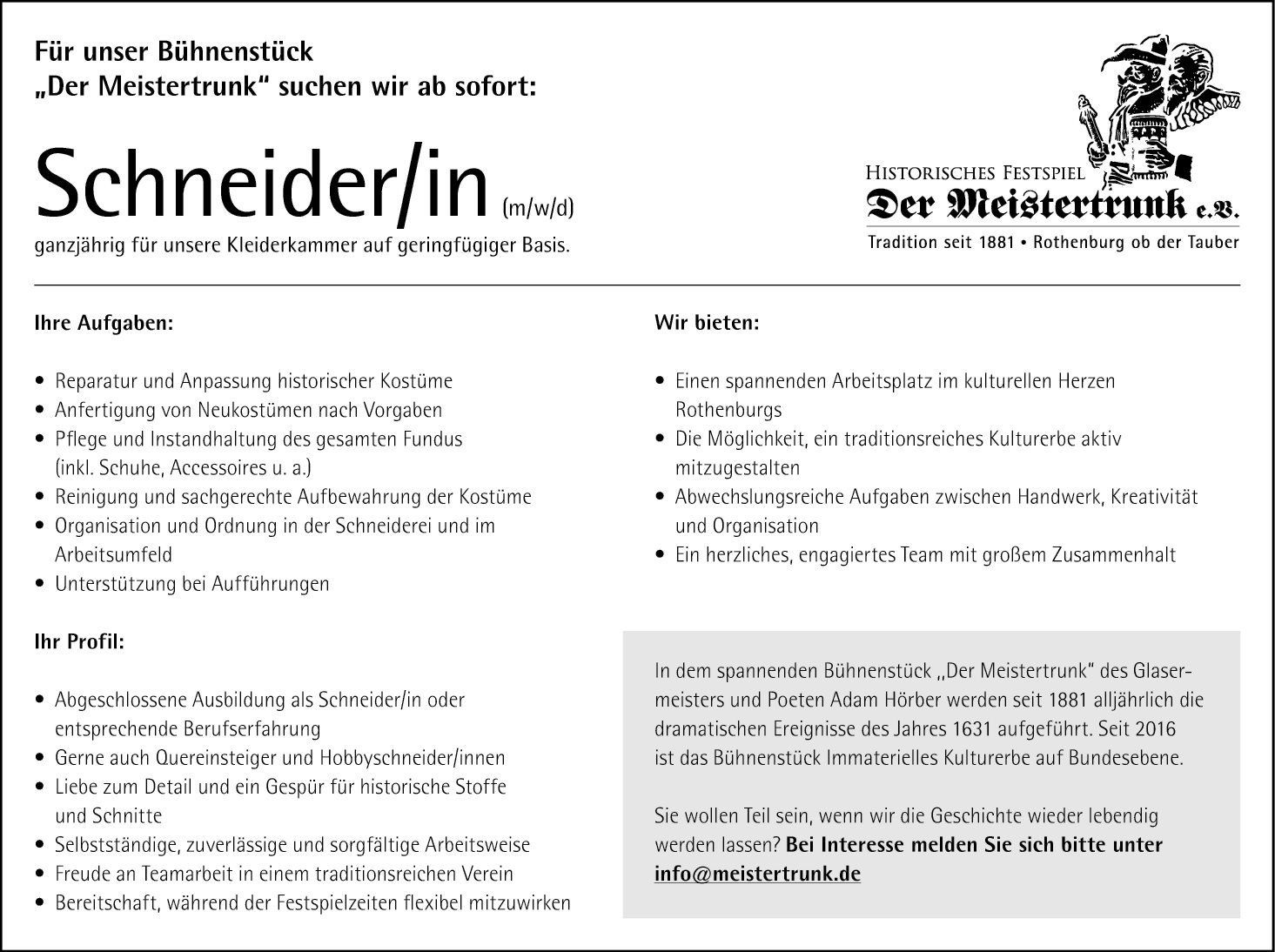 Jetzt Printanzeige ansehenFür unser Bühnenstück „Der Meistertrunk“ suchen wir ab sofort: