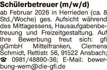 Schülerbetreuer (m/w/d) ab Februar 2026 in Herrieden (ca. 8 Std./Woche) ges. Aufsicht während des Mittagessens, Hausaufgabenbetreuung und Freizeitgestaltung.