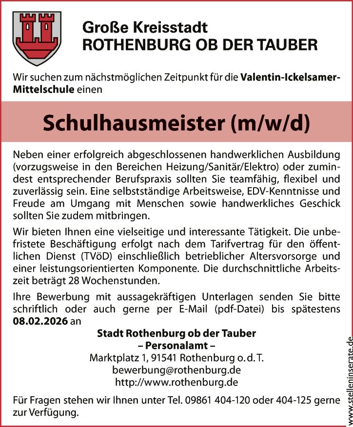 Ihre Bewerbung mit aussagekräftigen Unterlagen senden Sie bitte schriftlich oder auch gerne per E-Mail (pdf-Datei) bis spätestens 08.02.2026 an