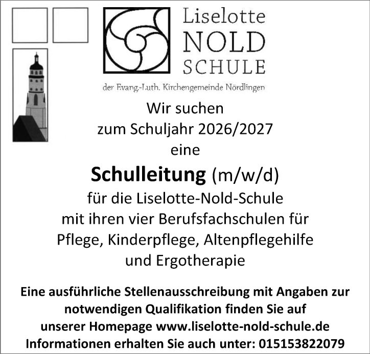 Wir suchen zum Schuljahr 2026/2027 eine Schulleitung (m/w/d) fĂŒr die Liselotte-Nold-Schule mit ihren vier Berufsfachschulen fĂŒr Pflege, Kinderpflege, Altenpflegehilfe und Ergotherapie.