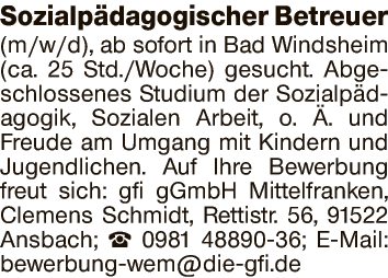Jetzt Printanzeige ansehenab sofort in Bad Windsheim (ca. 25 Std./Woche) gesucht. Abgeschlossenes Studium der Sozialpädagogik, Sozialen Arbeit, o. Ä. und Freude am Umgang mit Kindern und Jugendlichen.
