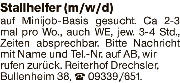 Stallhelfer (m/w/d) auf Minijob-Basis gesucht. Ca 2-3 mal pro Wo., auch WE, jew. 3-4 Std., Zeiten absprechbar.
