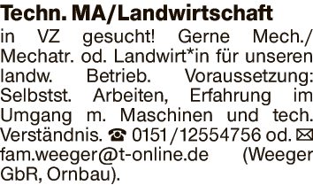 in VZ gesucht! Gerne Mech./Mechatr. od. Landwirt*in für unseren landw. Betrieb.