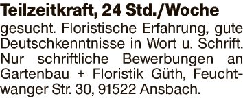 Teilzeitkraft, 24 Std./Woche gesucht. Floristische Erfahrung, gute Deutschkenntnisse in Wort u. Schrift.