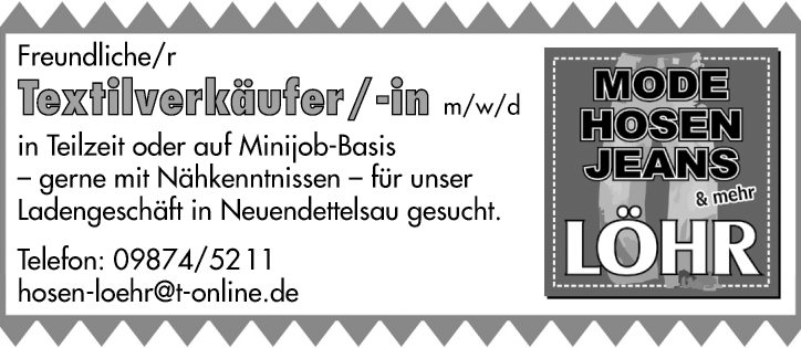 Freundliche/r Textilverkäufer/-in m/w/d in Teilzeit oder auf Minijob-Basis – gerne mit Nähkenntnissen – für unser Ladengeschäft in Neuendettelsau gesucht.