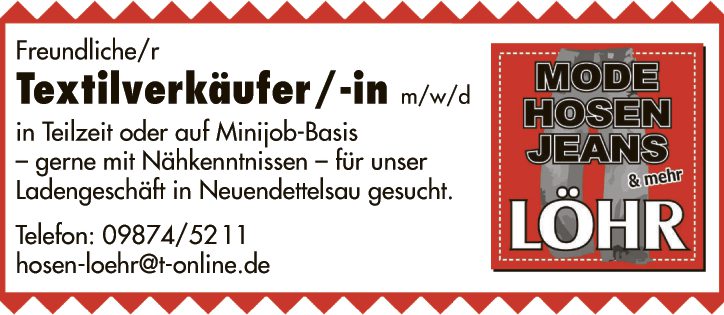 Freundliche/r Textilverkäufer/-in m/w/d in Teilzeit oder auf Minijob-Basis – gerne mit Nähkenntnissen – für unser Ladengeschäft in Neuendettelsau gesucht.